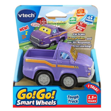Ready, set, go, go! The talking Go! Go! Smart Wheels Tough Truck drives imagination and development as it hauls loads and gets ready for road trips. This hard-working, fun-loving truck for kids explores first words, feelings and how to be helpful. Hear sounds, songs and phrases when you press the windshield, then see the car's face light up. Friendly phrases encourage kids to work hard and be helpers. Open and close the tailgate to hear sound effects and phrases and build motor skills. This truck is here to help!