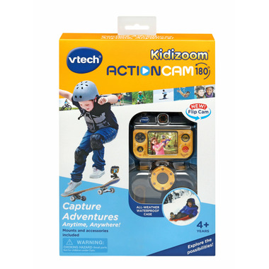 Capture your adventures wherever you are with the Kidizoom® Action Cam 180 by VTech®. The 180 degree rotatable camera lets you take photos and selfies, plus shoot videos with fun features like slow and fast-motion. Use the included accessories to mount the camera to your bike, skateboard and more while taking great action shots anytime, anywhere. Add the all-weather, water-resistant case for use up to six feet underwater. For even more fun, play one of the three included games. Get in on the action with the Kidizoom® Action Cam 180!