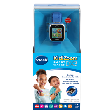 The coolest and best-selling kids' smartwatch brand is here - the KidiZoom Smartwatch DX3. The kid-friendly DX3 features dual cameras for pictures, selfies and videos along with one- and two-player games, daily reminders and more. The light on the watch doubles as camera flash and flashlight. Create custom clock faces from your own photos or swipe through 50+ animated faces to make time-telling exciting. Set Daily Reminders to help you stay on track, and switch to School mode when its time to limit the DX3 to a watch only. Play single-player games like Monster Catcher and find 80+ invisible creatures!