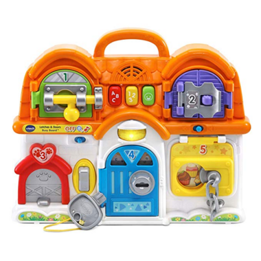 Knock, knock! Who’s behind the doors and windows of the Latches & Doors Busy Board™? Slide, press, twist or turn to unlock and open the doors and windows of the colorful house to build motor skills. Toddlers will find pictures of an adorable family, pets or a birthday party. This activity board reinforces learning by introducing numbers and animals. Three colorful buttons play the Alphabet Song, a number song or a playful song about the house. The busy board also includes a handle for play at home or away.