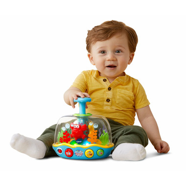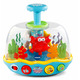 Dive into fun with the Learn & Spin Aquarium™. Press the blue water spout and watch it spin, light up and play music. Adorable ocean friends playfully swim and spin in the aquarium while the lights flash. Each time the plunger is pressed you will hear a playful phrase, a fun sound or a short tune. Three colourful buttons introduce animals, colours, numbers and play music. Listen to cheerful songs sung by the crab, fish and starfish. Make a splash with these spinning ocean friends!