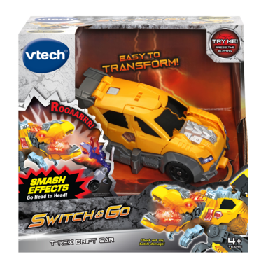 Stomp into the cool, crazy world of prehistoric creatures that turn into vehicles with the Switch & Go T-Rex Drift Car! Crash this Switch & Go into another one to see it explode with smash-and-crash fire effects. With the strongest bite ever, this predator is super tough. Time for a quick getaway? Transform the dino easily into an awesome Drift Car. Dino and vehicle sound effects bring your Switch & Go world to life. Pit the T-Rex Drift Car against the other Switch & Go dinos for a fearsome match-up. Who is most powerful? Fastest? Toughest? Smartest? Start your engine. Here we go! Additional Switch & Go dinosaurs sold separately. Intended for ages 4+ years. Requires 2 AA batteries. Batteries included for demo purposes only. New batteries recommended for regular use.