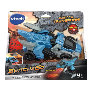 Stomp into the cool, crazy world of prehistoric creatures that turn into vehicles with the Switch & Go Velociraptor Race Car! This Velociraptor breathes fire with awesome light and sound effects. Check out the animated dino eyes! With speed and power on its side, this raptor is a treacherous predator. Time for a quick getaway? Transform the dino easily into a sleek Race Car. Check out its lightning trail! An animated race car driver makes the character change complete. Awesome fire lights and sound effects bring your Switch & Go world to life. Pit the Velociraptor Race Car against the other Switch & Go dinos for a fearsome match-up. Who is most powerful? Strongest? Toughest? Smartest? Start your engine. Here we go! Additional Switch & Go dinosaurs sold separately. Intended for ages 4+ years. Requires 2 AA batteries. Batteries included for demo purposes only. New batteries recommended for regular use.