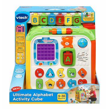 Get the building blocks of learning with the Ultimate Alphabet Activity Cube™ by VTech®. This cube has five interactive sides and includes 13 double-sided letter blocks that provide a variety of developmental benefits for years of play. Insert the blocks into the letter recognition slot and the cube will show the letter on the LED screen and introduce it through a playful song. Drop the letter blocks into the chute and each block will be counted or will play sounds as it drops down the peg maze. Press the ten colorful shape buttons to learn about numbers, colors, shapes, animal names and sounds, and hear simple questions that will keep toddlers engaged. Other sides of the cube feature animals to slide or flip, block-sorter holes, gears and more. The cube also has storage to hold all the blocks when they’re done playing. Your little one will have fun exploring all the ways there are to learn!