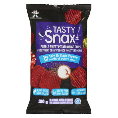 Tasty Snax - Purple Sweet Potato Rice Chips Sea Salt and Black Pepper Flavour. Use with dip or standalone snack.