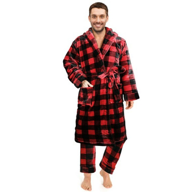 This men's hooded robe has a classic buffalo plaid design with a matching sash and front pockets for