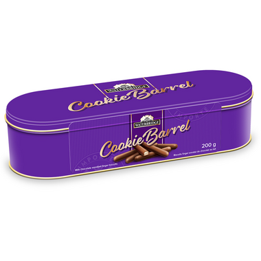 Waterbridge Cookie Barrel Tin contains milk chocolate enrobed finger biscuits.