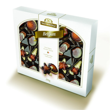 Waterbridge Finest Belgian Chocolate Seashells are the finest Belgian chocolates, in a mix of white and milk chocolate. Smooth and Creamy hazelnut praline enrobed in a delicate chocolate