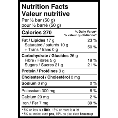 Ingredients: Organic cocoa mass, Organic cane sugar, Organic cocoa butter, Organic dried fruit bits (raspberry, blackcurrant, blueberry), Organic soya lecithin, Natural Blackberry flavour. May Contain: Milk, Wheat, Egg, Tree nuts.