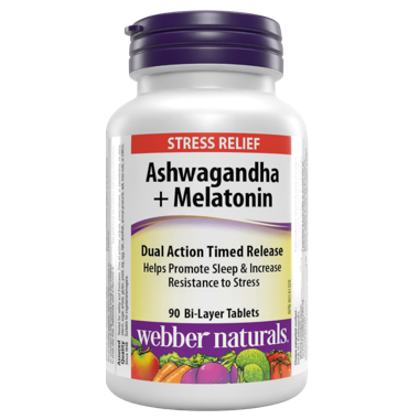 Ashwagandha + Melatonin from Webber Naturals offers a dual-action formula to help promote restful sleep. This bi-layer formula quickly releases 2.5 mg of melatonin alongside 250 mg of ashwagandha, a 10:1 standardized extract, to help you fall asleep and stay restful. Then it steadily releases another 2.5 mg of melatonin to help you stay asleep. When taken before bedtime, Ashwagandha + Melatonin can help reduce the time it takes to fall asleep and help increase total sleep time for a good nights rest.