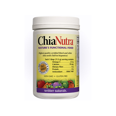 ChiaNutra is a rich source of Omega 3, fibre, protein and minerals. Studies show that chia improves regularity, helps balance blood sugar and reduces food cravings. It can lower systolic blood pressure and other risk factors for cardiovascular disease. ChiaNutra is an all-natural non-GMO product certified by the Nutritional Science Research Institute (NSRI). It is highly stable due to its antioxidant content.