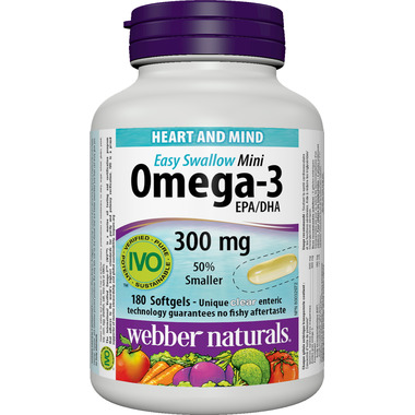 Omega-3 fatty acids are essential in supporting cardiovascular and brain health. They lower triglyceride levels, support healthy brain function and mood, and help fight inflammation. Omega-3 Mini from Webber Naturals provides fatty acids your body needs in a smaller, easy-to-swallow clear enteric softgel.
