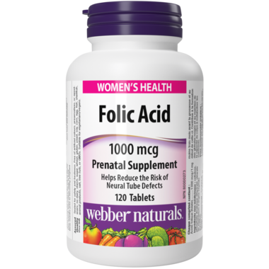 Folic Acid from Webber Naturals is an important prenatal nutrient to be taken daily at least three months before and during the early stages of pregnancy to help reduce the risk of neural tube defects. Each tablet contains 1000 mcg of folate, a B vitamin that helps support normal early fetal development and form red blood cells.