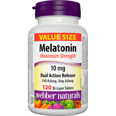 Melatonin Maximum Strength Dual Action Release 10 mg from Webber Naturals helps restore the natural sleep-wake cycle for better, more restorative sleep. The advanced bilayer technology offers an immediate release of 5mg of melatonin to reduce the time it takes to fall asleep, followed by a gradual release of 5mg of melatonin to increase sleep quality and duration, and help relieve daytime fatigue.