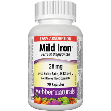 Webber Naturals Mild Iron is uniquely formulated to support your body in making healthy red blood cells. It contains vitamin B12, folic acid and ferrous bisglycinate, a form of iron that is better absorbed, has fewer side effects and is safer than other forms of supplemental iron.