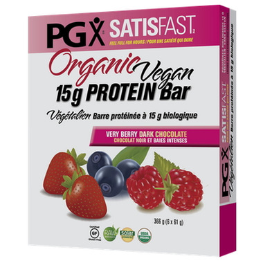 PGX Satisfast Vegan Organic 15 g Protein Bars are made with PGX, plant protein, and fresh raw foods, all coated in organic dark chocolate. These vegan, gluten-free, protein-rich bars reduce food cravings, prolong fullness, promote healthy weight, and are ideal for athletes and anyone looking to boost protein intake.