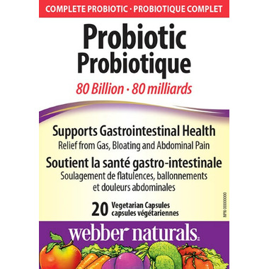 Probiotic 80 Billion from Webber Naturals is a guaranteed, high-potency, multi-strain formula for comprehensive gastrointestinal support, helping to relieve gas, bloating, and abdominal pain. This shelf-stable formula features eight probiotic strains, including lactobacilli, bifidobacteria, and pediococci, to support healthy gut flora and digestion. It is ideal for travel, with no refrigeration required!