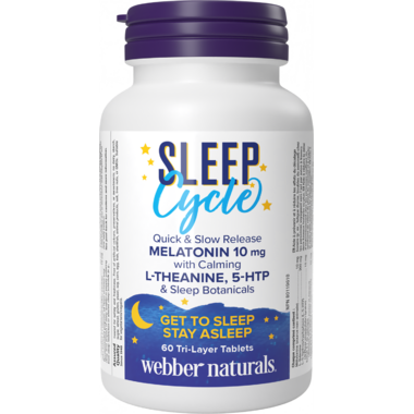 Sleep Cycle from Webber Naturals offers triple-action support for a more restful nights sleep. This formula quickly releases 5 mg of melatonin along with a calming nighttime botanical blend, plus 5-HTP and L-theanine to help you fall asleep more easily. It then steadily releases another 5 mg of melatonin throughout the night to improve the duration and quality of your sleep. Sleep Cycle helps you fall asleep faster, stay asleep longer, and wake up feeling refreshed!
