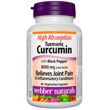 High Absorption Turmeric Curcumin with Black Pepper from Webber Naturals combines curcumin from turmeric with black pepper extract for enhanced absorption. Each vegetarian capsule contains 400 mg of 20:1 turmeric extract, equivalent to 8,000 mg of raw herb. Each capsule is standardized to 25% curcuminoids, one of turmeric’s most active constituents. Turmeric is used in herbal medicine to help relieve joint inflammation and provide antioxidant protection for the maintenance of good health.