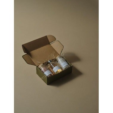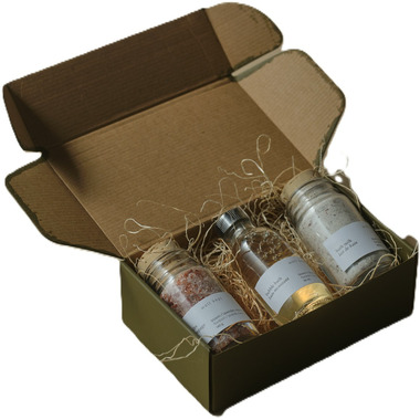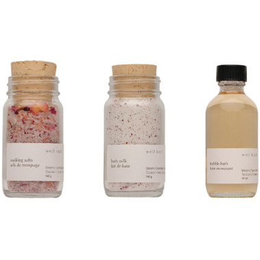 A calming ritual for gentle evenings. This trio includes one-time-use portions of bath milk, soaking salt, and bubble bath in the Bloom scent an essential oil blend of lavender, rose, and frankincense. A thoughtful gesture or small moment of calm.