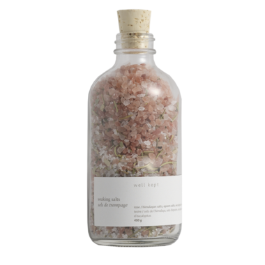 Well Kepts soaking salts in ROSE create a soothing, relaxing bathing ritual. Alongside the himalayan salts, the eucalyptus assists in soothing the skin while the rosemary and peppermint provide a cooling and refreshing effect.