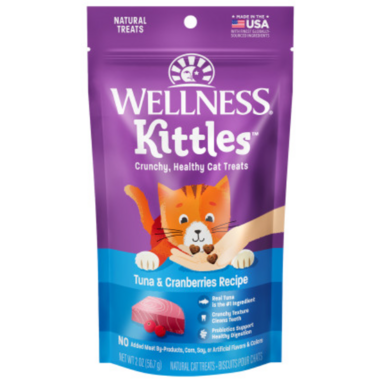 Wellness Kittles Grain Free Natural Cat Treats, Tuna & Cranberries Recipe are irresistibly tasty, 100% all-natural wheat free, grain free crunchy treats made in USA only. These natural crunchy dental cat treats not only are as tasty as they are healthy, but have a crunchy texture that helps to clean your cat's teeth. Each all-natural treat bite is packed with big taste from whole-food ingredients like tuna, cranberries and blueberries. With nothing artificial and under 2 calories each, you can show your cat extra love with Wellness Kittles natural cat treats.