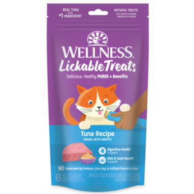 Wellness Lickable Treats for cats are as tasty as they are healthy. A pureed treat your cat will love, these handheld treats are complete & balanced for adult cats and help support digestive & immune health. Simply open the tube, squeeze out a little bit of the puree and watch your cat run to you.