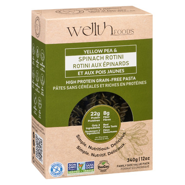 Yellow Pea & Spinach Rotini high in protein grain-free pasta.