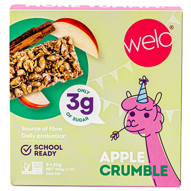 Ingredients: Whole Grain Rolled Oats, Whole Grain Brown Rice Crisps, Brown Rice Syrup, Sunflower Seed Butter, Vegetable Glycerin, Dried Diced Apples, Chicory Root Fibre, Dates, Sunflower Oil, Natural Flavor, Sea Salt, Cinnamon, Probiotic Cultures (Bacillus Subtilis De111).