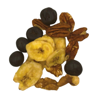 A flavorful blend of Organic Banana Chips, Walnuts, Pecans, Hazelnuts, and Dark Chocolate Covered Cranberries.