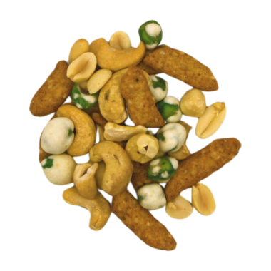 Wasabi Peas deliver a spicy punch balanced by the satisfying crunch of Sesame Sticks. The Roasted Blanched Peanuts and Cashews add a rich, nutty dimension, creating a savory, spicy, and salty.