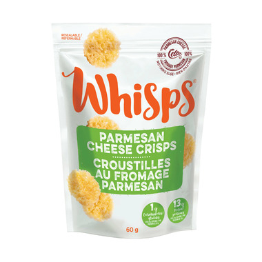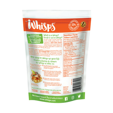 Whisps Cheese Crisps Parmesan Cheese – made with real cheese and nothing else. What is a Whisps? An airy, crispy, crunchy, and tasty snack made solely from one ingredient: 100% Cello Cheese! Made from Cello’s deliciously sharp backed Cheddar cheese, Whisps are an excellent source of calcium and protein. Enjoy them in a salad or by the handful straight out of the bag.