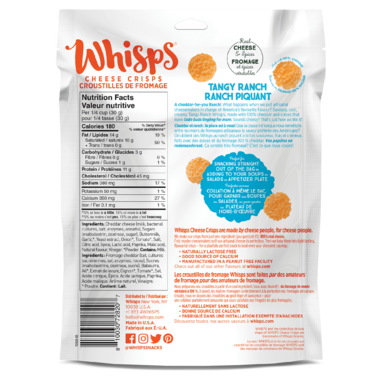 Whisps Cheese Crisps Tangy Ranch – made with real cheese and spices. A cheddar for you Ranch! What happens when Whisps put artisanal cheesemakers in charge of America’s favourite flavour? Savory, cool, creamy Tangy Ranch Whisps, made with 100% cheddar and spices that leave taste buds tingling for more. Sound cheesy? That’s just how Whisps like it!
