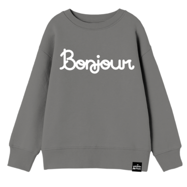 Whistle & Flute's new Bonjour design is printed in white on a grey Organic Cotton Fleece Drop Shoulder Sweatshirt. Whistle & Flute clothes are designed to be Playful, Unisex and Cool. Using the softest fabrics and safest inks; so your kids can be comfortable at all times. Focusing on quality so they can be worn for years to come!