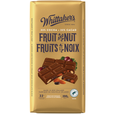 Fruit and nut creamy milk chocolate bar with 33% cocoa. Made in New Zealand since 1896.