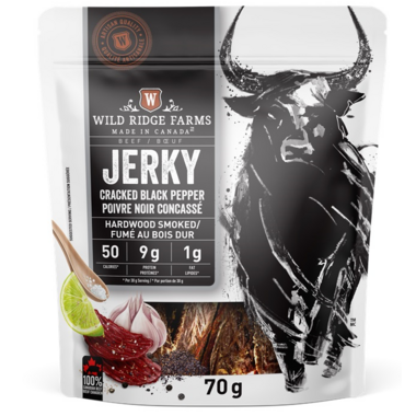 Wild Ridge Beef Jerky Cracked Black Pepper is made with 100% Canadian Beef and quality ingredients. High in Protein.