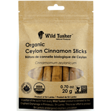 Wild Tusker's Organic Ceylon Cinnamon Sticks have a delicate multilayer texture, exquisite fragrance and a warm sweet taste. "True Cinnamon" is the Ceylon Cinnamon grown in Sri Lanka, while Cassia (Chinese Cinnamon) is the most commonly available "Cinnamon" in most stores. The Ceylon Cinnamon quill is golden brown, multilayered and has a very delicate texture while Cassia has a darker colour and a thicker, hollowed quill. Ceylon Cinnamon has a more refined taste than Cassia and much lower levels of the toxin coumarin. A portion of each sale of "Wild Tusker" brand products goes towards the Pinnawala Elephant Orphanage in Sri Lanka.