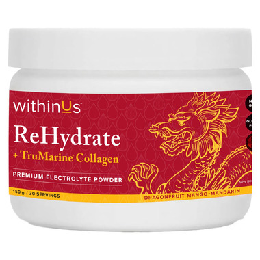 Sweat, Rehydrate, Repeat withinUs ReHydrate + TruMarine Collagen is a premium electrolyte drink powder with the added benefits of TruMarine Collagen. The carefully selected minerals work to replenish electrolytes lost through sweat from heat and exercise.