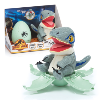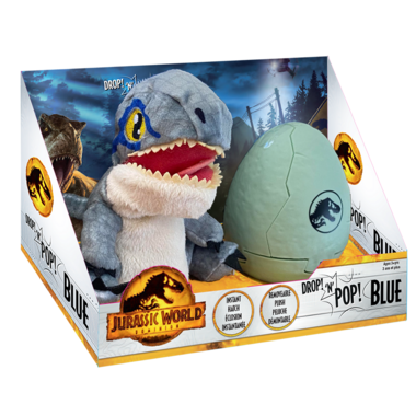 The plush is hidden inside the egg but as soon as it hits the floor out pops the Blue! The plush can then be removed by twisting the two parts.