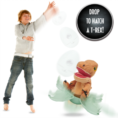 The plush is hidden inside the egg but as soon as it hits the floor out pops the T.rex! The plush can then be removed by twisting the two parts.