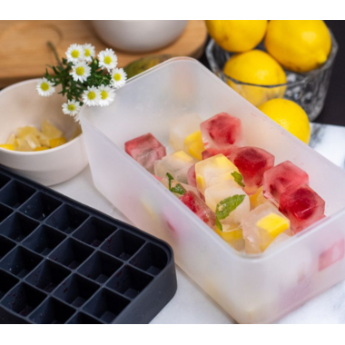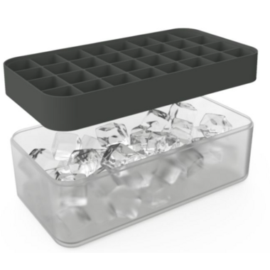 This Ice Cube Box & Tray Set is made of silicone and BPA free plastic. Silicone tray freezes 32 ice cubes. Box stores 96 ice cubes.