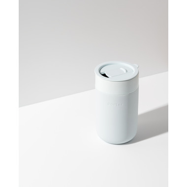 W&P Design's To-Go Mug is crafted from durable ceramic with a matte silicone sleeve and a BPA-free press-fit lid. The silicone sleeve is grippable, soft on the hands, and prevents scratches on surfaces. The splash-resistant lid is designed for gentle transit and fits in most car cup holders. Microwave and dishwasher safe.