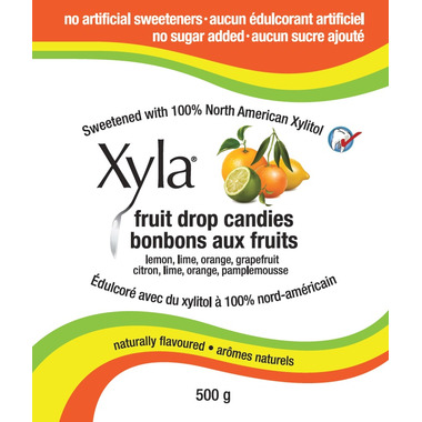 Xyla Naturally Flavoured Fruit Drop Candies are sweetened with xylitol, made from 100% North American hardwood trees. They are "non-cariogenic" which means they won’t cause cavities or promote dental caries.