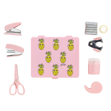 Think of it as a must have mini office kit perfect for on-the-go. Pencil sharpener? Check. Scissors? Check. Stapler, staple remover, and staples? Check. Tape dispenser, hole punch? Check. Yoobi's got you covered for any supply emergency. All mini sized and organized in a pink pineapple printed carrying case, of course.