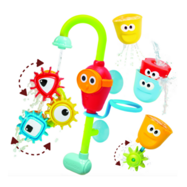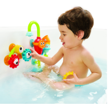 A battery operated bath spout that attaches and draws water from the tub, creating an endless stream without wasting water from the bath tap. More than 10 different activities. 3 interchangeable bath cups, each with a different water straining, spouting and spraying effect, plus a spinning propeller.