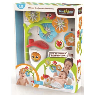 Yookidoo Spin 'N' Sprinkle Sensory Arc features a water spraying bird and colourful flowers. It spins and sprinkles water gently over baby, providing a soothing bath time experience. An interchageable fastening device, allows attachment to a portable baby bathtub, or a regular bathtub. Requires 3 AAA batteries (sold separately).