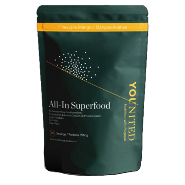 Younited's All-In Organic Superfood is a delicious blend of over 50, 100% organic food ingredients, carefully selected to provide over 50% of the RDA of 20 food sourced vitamins and minerals.