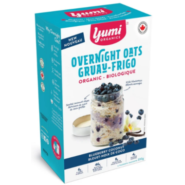 Yumi Organics Overnight Oats Blueberry Vanilla with toasted coconut chips, wild blueberries.