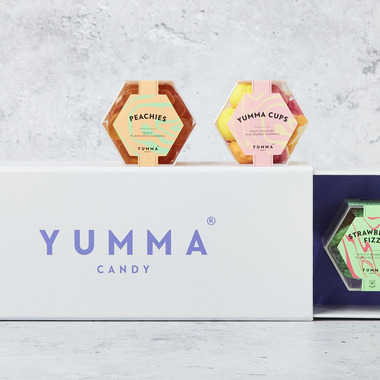 A three-piece gift set with a pull-out drawer. Inside are Yumma Candy's Peachies, Yumma Cups and Squishies in hexagonal pots. Perfect for Valentine's Day gifting for both adults and children alike.