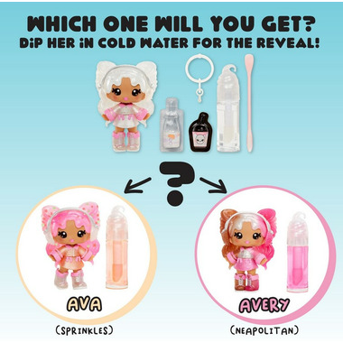 Welcome to Yummiland, where seven NEW Yummi characters join in to protect their incredible, edible city with their lip gloss superpowers. Play along by mixing and creating your very own special lip gloss! Each includes base, colour and scent along with removable keychain to take your lip gloss and Lip Gloss Doll on-the-go. Yummiland Lip Gloss Dolls are articulated and feature removable fashions and accessories so you can customize. This collection includes two mystery chase characters with surprise flavours! Ava and Avery live in Yummiland where they are the #1 (and #2) fans of the adventure-seeking Yummis! These twins special lip gloss gives them the superpower of double trouble and hiding in plain sight! Play along at home with your scented Ava and Avery dolls by creating your own candy scented lip glosses. These special mystery doll colours are revealed when dipped into cold water. Which one will you get?